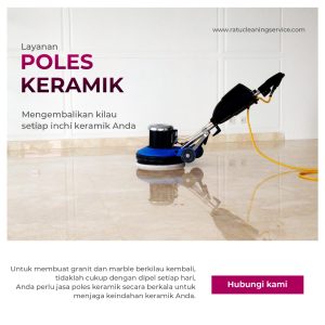 **Poles Granit/Marmer/Keramik:** Mengembalikan kemilau dan kemewahan lantai serta dinding Anda melalui *treatment* dan perawatan khusus. Material spesial butuh perawatan spesial. Hubungi kami untuk mengembalikan kemewahan apartemen/hotel Anda sekarang juga.